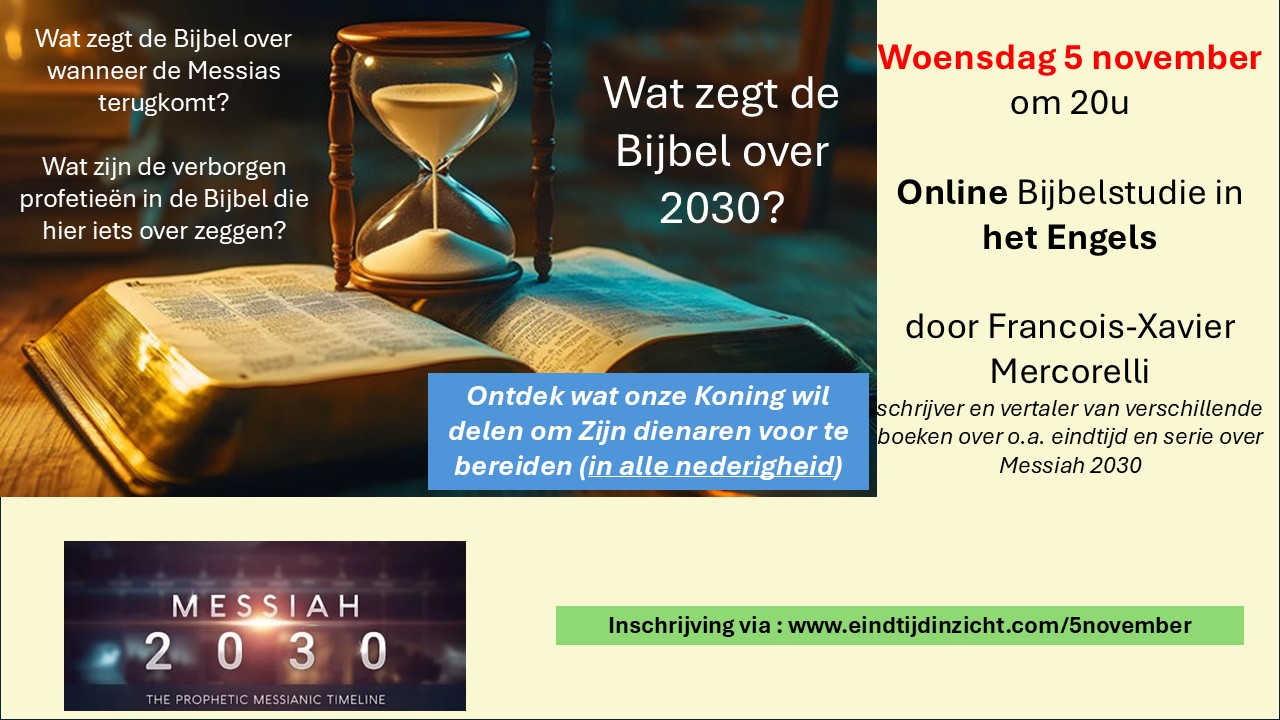 In deze online studie leer je wat de profetieën in de Bijbel vertellen over de timing van de wederkomst van de Messias, Jezus/Yeshua. We zullen onderzoeken waarom 2030 een interessant en plausibel jaar kan zijn, zonder te vergeten dat we open moeten zijn voor andere inzichten.