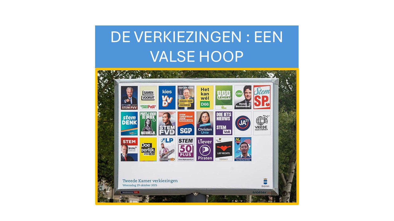 Een aantal mensen stellen hun hele hoop op de uitkomst van de verkiezingen. Een kabinet is hier maar voor een paar jaar, als het goed is. De macht die ze hebben om bepaalde dingen te veranderen is in die zin beperkt. Het is uiteraard belangrijk als burger om te gaan stemmen. Maar de echte hoop waar de wereld op wacht, zit ergens anders. Niet een groep mensen die een paar jaren iets lokaals kunnen wijzigen of verbeteren.
